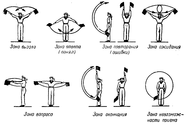 Флажной семафор — наиболее распространенный и доступный вид связи. Сущность его в том, что каждой букве русского алфавита соответствует определенное положение рук. В семафорной азбуке насчитывается 29 буквенных знаков, 8 служебных и 4 знака перемены места. Для того чтобы пользоваться флажным семафором, судоводитель-любитель должен его хорошо знать, а на судне в плавании иметь два флага яркой окраски, прибитых к ручкам для удобства пользования. Необходимо иметь также запасную пару семафорных флажков.