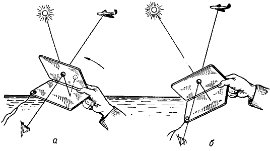 К световой сигнализации относится также светосигнальное зеркало (гелиограф), которое представляет собой прибор, позволяющий подавать отраженные зеркалом лучи в виде световых сигналов на расстоянии до 20 миль. Основан этот прибор на наведении отражения солнечного диска («зайчика») на интересующий объект. Сигнальное зеркало состоит из двух скрепленных на шарнире металлических пластинок, поверхность одной из которых хромирована и отполирована. Пластинка имеет визирное отверстие. Для подачи сигналов зеркало следует держать в руке таким образом, чтобы в его визирное отверстие на верхней створке было видно судно или самолет, которым подается сигнал (рис. 149, а). Чтобы «зайчик» упал на цель и на судне или самолете заметили ваш сигнал, необходимо развернуть зеркало так, чтобы луч, прошедший через визирное отверстие и отраженный от нижней створки на внутреннюю поверхность верхней створки в виде светлого кружка, совпал с визирным отверстием.