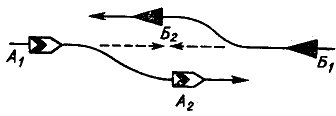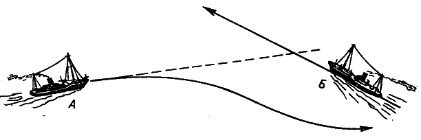 Суда с механическим двигателем уступают дорогу парусному судну. Последнее, однако, не должно преднамеренно находиться на курсе судна с механическим двигателем. Гребные шлюпки уступают дорогу левыми бортами при встречных курсах парусным судам. Когда два судна с механическими двигателями идут прямо или почти прямо друг на друга так, что возникает опасность столкновения, каждое судно обязано уклониться вправо, чтобы разойтись левыми бортами. Это правило применяется только тогда, когда мачты (или топовые огни) встречного судна находятся в створе и прямо по носу и видны оба отличительных огня. Если два судна А и Б (см. рис.) с механическими двигателями идут пересекающимися курсами, то уступает дорогу судно А, которое видит другое судно Б со своего правого борта. При этом судно Б, которому уступают дорогу, должно идти прежним курсом и с прежней скоростью, чтобы не ввести в заблуждение водителя другого судна А.