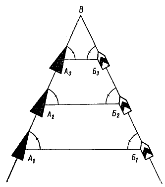 Если пеленг меняется на корму, значит встречное судно пройдет за кормой. Если пеленг изменяется на нос, то встречное судно пройдет впереди по курсу (см. рис). Судоводитель для наблюдения за изменением пеленга может воспользоваться любыми предметами, расположенными на судне, в створе которых находится встречное судно в момент его обнаружения.