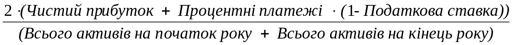 Пояснимо походження чисельника цієї формули. Справа в тому, що "при формуванні активів використовуються два фінансових джерела — позиковий і джерело власних коштів. За існуючим законодавством процентні платежі за використання позиковими коштами включаються в число валових витрат, у той час як доход прямих інвесторів виплачується із прибутку у вигляді дивідендів або залишається на підприємстві, будучи реінвестований у додаткові активи. У той же час при формуванні активів ми не розрізняємо, який долар прийшов у складі позикових коштів, а який — був внесений власником підприємства в момент покупки акцій. Суть показника рентабельності полягає в характеристиці того, наскільки ефективно був використаний кожний притягнутий долар. Із цієї причини ми повинні виключити з розгляду доходи, які є винагородою власникам капіталу, як власного, так і позикового. Але винагорода власникам позикового капіталу вже була врахована при розрахунку чистого прибутку. Тому ми повинні виключити із чистого прибутку величину процентних платежів, виплачених до податку на прибуток. Цим і пояснюється поява додаткового члена в чисельнику формули для визначення рентабельності активів.