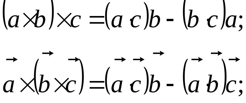 Результат першого добутку скаляр . Результат другого вектор, який називається подвійним добутком або векторно- векторним добутком трьох даних векторів. Для знаходження подвійного векторного добутку використовують формули.