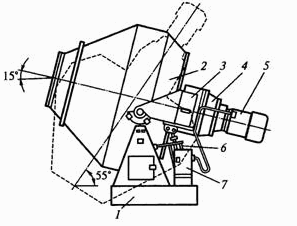 Стационарные циклического действия гравитационные бетоносмесители применяют на бетонных заводах, снабжающих товарным бетоном объекты с большим объемом потребления, в бетоносмесительных цехах заводов сборных железобетонных изделий и в бетоносмесительных установках. Они выпускаются объемом готового замеса 500,1000 и 3000 л и выполняются с наклоняющимися двухконусными смесительными барабанами и гидравлическим или пневматическим приводом механизма опрокидывания барабана. У стационарных гравитационных бетоносмесителей загрузка компонентов и выгрузка готовой смеси механизированы и осуществляются при вращающемся барабане. Бетоносмеситель СБ-91В объемом готового замеса 500 л предназначен для приготовления подвижных бетонных смесей и используется в бетоносмесительных установках производительностью до 20 м3/ч. Бетоносмеситель состоит из рамы 4, смесительного барабана 2, траверсы 7, приводных механизмов вращения 6 и опрокидывания 5 смесительного барабана, электрооборудования, аппаратуры пуска, защиты и управления. Траверса со смесительным барабаном опирается на две стойки 3 рамы, в одной из которых смонтирован гидравлический механизм (гидроцилиндр с рычагом) опрокидывания смесительного барабана при разгрузке (рис. 21.1). Гидроцилиндром, соединенным с одной из цапф 1 траверсы, через рычаг осуществляется поворот траверсы вместе со смесительным барабаном при переводе барабана из положения приготовления смеси в положение выгрузки и обратно. На внутренней поверхности конусов смесительного барабана, облицованных футеровкой, закреплены шесть смешивающих лопастей. Вращение барабану с частотой 18 мин-1 сообщается от электродвигателя через цилиндрический двухступенчатый редуктор. Гидропривод механизма опрокидывания барабана состоит из масляного бака, гидронасоса, гидрораспределителя, фильтра, клапанной аппаратуры и соединительных трубопроводов.