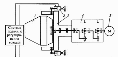 Рис.213 . Пневмокинематическая схема бетоносмесителя СБ-153А: 1 - смесительный барабан; 2 - пневмоцилинлр; 3 - траверса; 4 - планетарный редуктор; 5 – электродвигатель