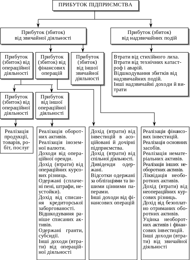 Під фінансовими результатами розуміють величину прибутку або збитку. У загальному випадку прибуток – це перевищення доходів від діяльності над витратами з нею пов’язаними. У протилежному випадку - має місце збиток. Слід мати на увазі, що згідно П(С)БО 3 вся діяльність підприємства класифікується на звичайну та надзвичайну. Звичайна на операційну та іншу звичайну (інвестиційну та фінансову). Операційна на основну та іншу операційну. За кожним видом діяльності фінансовий результат визначають шляхом співставлення доходів і витрат.