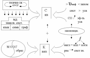 Эффективным способом обработки и компоновки информации является ее «сжатие», т.е. представление в компактном, удобном для использования виде. Разработкой моделей представления знаний в «сжатом» виде занимается специальная отрасль информационной технологии – инженерия знаний. Дидактическая адаптация концепции инженерии знаний основана на том, что, «во-первых, создатели интеллектуальных систем опираются на механизмы обработки и применения знаний человеком, используя при этом аналогии нейронных систем головного мозга человека. Во-вторых, пользователем интеллектуальных систем выступает человек, что предполагает кодирование и декодирование информации средствами, удобными пользователю, т.е. как при построении, так и при применении интеллектуальных систем учитываются механизмы обучения человека». К основам сжатия учебной информации можно отнести также теорию содержательного обобщения В.В. Давыдова, теорию укрупнения дидактических единиц П.М. Эрдниева. Под «сжатием» информации понимается прежде всего ее обобщение, укрупнение, систематизация, генерализация. П.М. Эрдниев утверждает, «что наибольшая прочность освоения программного материала достигается при подаче учебной информации одновременно на четырех кодах: рисуночном, числовом, символическом, словесном». Следует также учесть, что способность преобразовывать устную и письменную информацию в визуальную форму является профессиональным качеством многих специалистов. Следовательно, в процессе обучения должны формироваться элементы профессионального мышления: