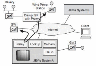 Интернет обычно предлагает IP соединение равноправных узлов ЛВС только в режиме он-лайн. К сожалению, в зависимости от Поставщика интернет-услуг, некоторые коммутируемые узлы скрыты за прокси IP так, что чтобы они не могут осуществлять свои задачи (открытый и «прослушивание» IP) во внешней сети. В этом случае методы, используемые IRC-чатом, должны быть применены, где публично доступный сервер запрашивает узлы сети глобального энергетического менеджмента, которые появляются как IP клиенты. Рисунок 104, например, показывает ветряную электростанцию и шлюз GW1, между которыми должно быть соединение. Так как ветряная электростанция находится вне сети прокси, она используют систему JEVis, вместо использования IP соединения. То же самое произошло бы, если шлюз соединялся он-лайн через стандартный GPRS протокол, так как узел GPRS получает «внутренний» IP-адрес недоступный для подключения извне. Такие брандмауэры, сети прокси и другие особенности сети Интернет ограничивают коммуникацию в широком масштабе, и поэтому система должна использовать технологии, которые широко используются, поддерживаются и не запрещены поставщиками интернет-услуг. Дополнительно, узлы могут быть организованы в кластеры и группы, где не каждый узел знает, кто и где его пара. Как следствие должны быть некоторые справочные таблицы, где узлы могут зарегистрироваться, чтобы быть найденными другими узлами.