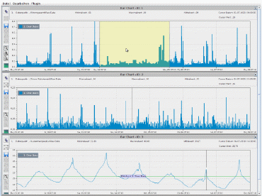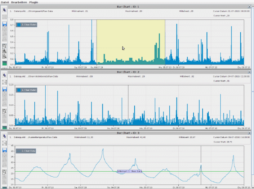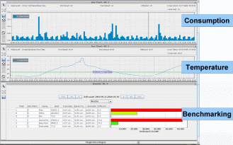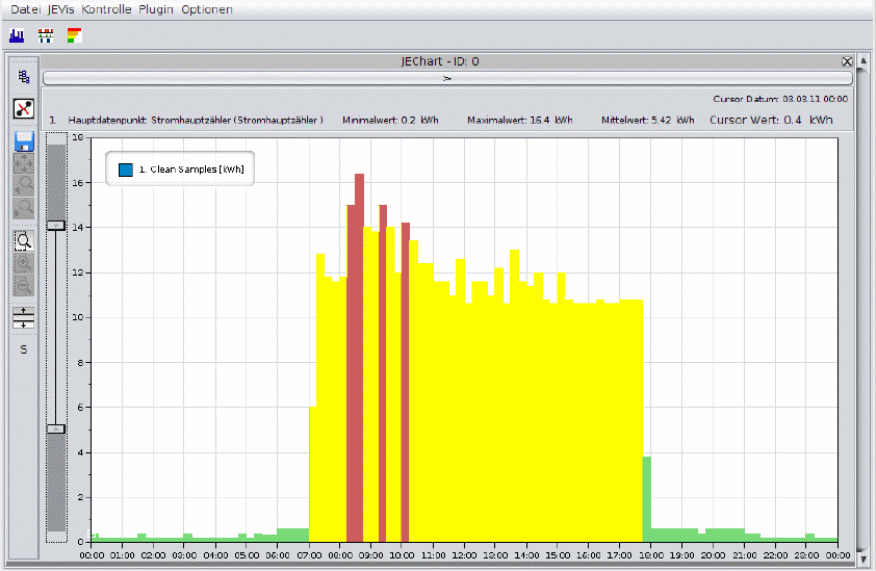 Модуль JEChart является графическим интерфейсом пользователя(GUI), который предлагает графики и сравнения данных, таких как потребление, переключение состояний или расходов. JEChart позволяет нарисовать линии гистограммы и поддерживает различные дополнительные графические опции, такие как масштабирование и, выделенный цветом, порог визуализации.