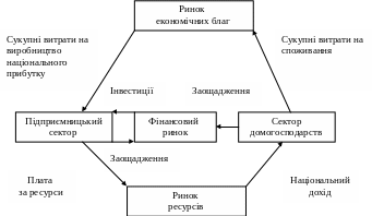 На рис. 2. для спрощення не відображено рух ресурсів та вироблених товарів і послуг, а показано лише рух грошових потоків, які спрямовані у зворотному напрямку до речових потоків.