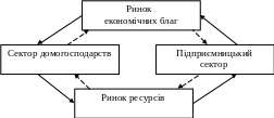 Проста модель кругообороту ресурсів, товарів і послуг (благ) та доходів у закритій приватній економіці виходить із взаємовідносин двох основних приватних агрегованих суб’єктів: сектору домогосподарств та підприємницького сектору.