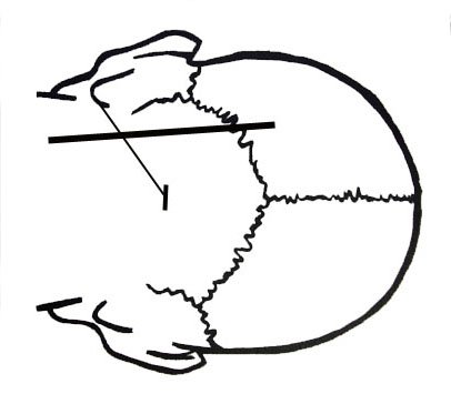 Производится линейный разрез кожи позади сосцевидного отростка через точку, расположенную на середине линии, соединяющей наружный затылочный бугор и верхушку сосцевидного отростка. Ввиду ригидности мягких тканей фиксированного трупа длина разреза может быть больше, чем при реальной операции и разрез может иметь Т-образную форму (рис. 1).