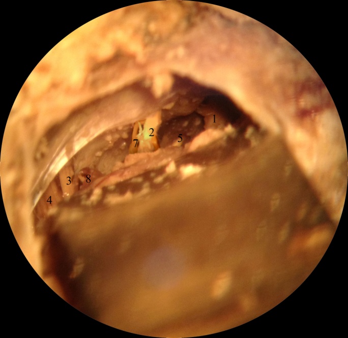 Рис. 6. Структуры понто-церебеллярной и медулло-церебеллярной цистерн. 1 –тройничный нерв, 2 –акустико-фациальная группа, 3 – языкоглоточный нерв, 4 – прочие нервы каудальной группы, 5 – отводящий нерв (вход в канал Дорелло), 7 – передняя нижняя мозжечковая артерия, 8 – задняя нижняя мозжечковая артерия