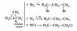 1.Галогенирование (на свету или при t). При хлорировании или бромировании алкана с вторичными или третичными атомами углерода легче всего идет замещение водорода у третичного атома, труднее у вторичного и еще труднее у первичного. Поэтому, например, при бромировании пропана основным продуктом реакции является 2-бромпропан. |