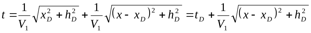Тоді точка D стає джерелом дифрагованих хвиль, які будуть розповсюджуватись від неї на усі боки і досягнуть земної поверхні. Позначимо координати точки D через xD та hD і визначимо час пробігу хвилі з джерела О до точки дифракції D і з точки дифракції D до будь-якої довільної точки P з абсцисою x,що лежить на плоскій і горизонтальній земній поверхні: