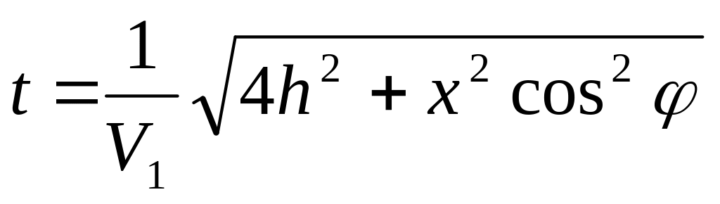 Тут x1 – абсциса точки мінімуму годографа ЗГТ, а x2 – абсциса загальної глибинної точки (або центру загальної глибинної площадки). Час t1 дорівнює подвоєному часові пробігу хвилі з загальної глибинної точки до земної поверхні (площині проведення) по нормалі до відбивальної поверхні, а час t2 дорівнює подвоєному часу пробігу хвилі з загальної глибинної точки до земної поверхні (площини приведення) по нормалі до останньої.
