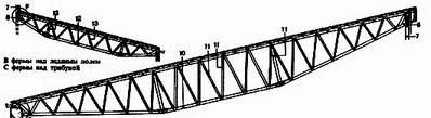 Раскосы и стойки фермы над ледовым полем выполнены из трех досок. Работают как ц.с. и ц.р. элементы ДК. Расчетные усилия в элементах решетки определяются при загружении 0,5 пролета.