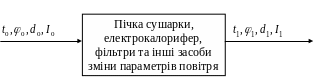Агент сушіння утворюється в топці або калорифері. На рис.4.5 зображена схема топки (калорифера) й надходження до неї повітря з параметрами tₒ, φₒ , dₒ, Iₒ і вихід з неї агента сушіння з параметрами t1 , φ1, d1, I1.Фізичний зміст цих параметрів розкритий вище. Параметри t1 , φ1, d1, I1. змінилися завдяки тому , що в топці (калорифері) при спалюванні палива виділилося Q теплоти. Температура t1 задана: це температура агента сушіння, вона не повинна бути більшою за допустиму. Визначимо, чому рівні параметри φ1, d1, I1 залежно від tₒ, φₒ , dₒ, Iₒ, t1 та Q.