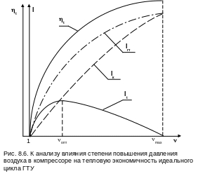 Выражение (8.13) позволяет сделать вывод о том, что КПД ГТУ будет увеличиваться с возрастанием температуры Т3 и уменьшением Т1 (при увеличении ).