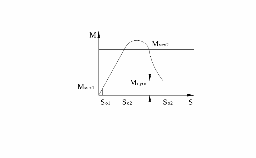 Динамічна рівновага, при якій кутова швидкість ротора двигуна постійна, визначається рівністю гальмівного механічного та обертового електромагнітного моментів. При збільшенні механічного моменту (до знач. Ммех2) зменшується частота обертання ротора АД (ковзання збільшується від S01 до S02..