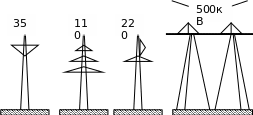 Металеві проводи ПЛ підвішуються до опор через ізолятори, що мають спеціальні затискачі. Опори виконуються дерев’яними, металевими і з/б в залежності від призначення ліній, напруги мережі, економічних міркувань і т.п. Деякі конструкції опор призначені для підтримання проводів, вони сприймають тільки вертикальні нав-ня ваги проводів і називаються проміжними. Існують конструкції опор, сприймаючих горизонтальні навантаження ваги проводів, вони називаються анкерними. Крім того, виконуються опори спеціального призначення для переходу лінії через водяні перешкоди та гірські ущелини, для зміни напрямку лінії і т.п. Ріст напруги ел.передачі тісно пов’язаний із загальним зростанням потужності енергетичної системи нашої країни, розвитком її промисловості та необхідністю передачі все більшої енергії та потужності на великі відстані