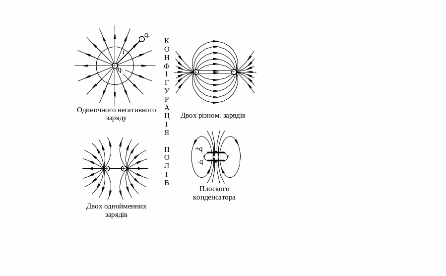 ξ2 = q1/ε4πr122 F = q2 ξ2 (Конфігурація полів одиничного негативного заряду).
