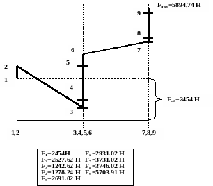 F9= F8+F8-9=1,12F1 + 2839,73 +15,7 = 1,12F1 + 2955,43 Н;