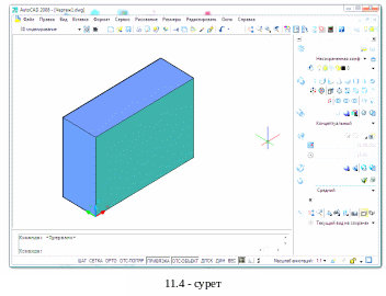 11.3 және 11.4–суреттерде жоғарыдағы параметрлермен берілген параллелепипед көрсетілген. 11.3-суретте каркастық модель, ал 11.4-суретте Визуалды стильдің Концептуальный командасының көмегімен бұйымды бояп көрсеткен.