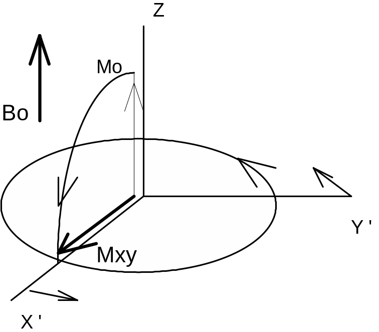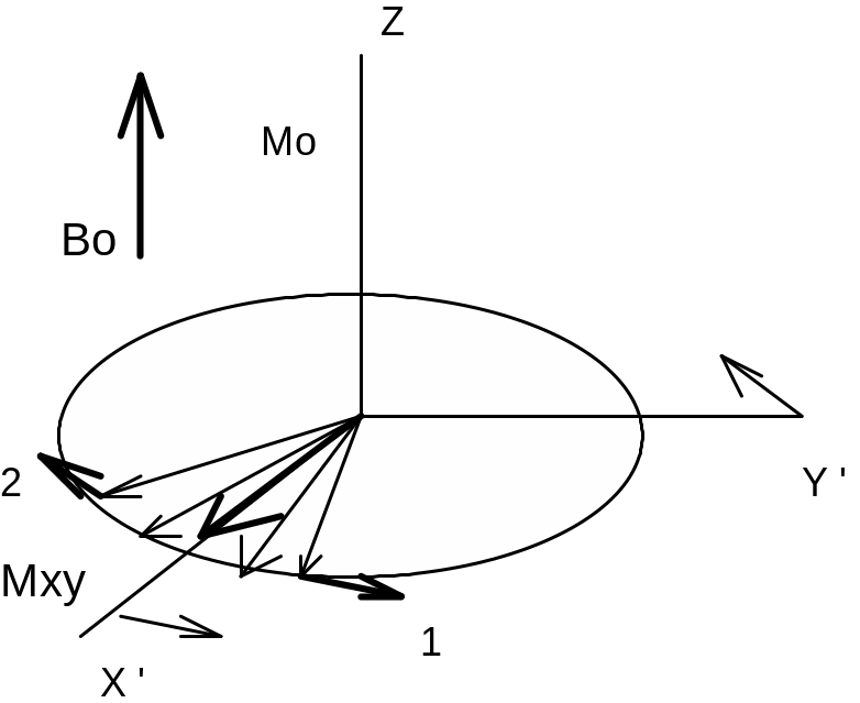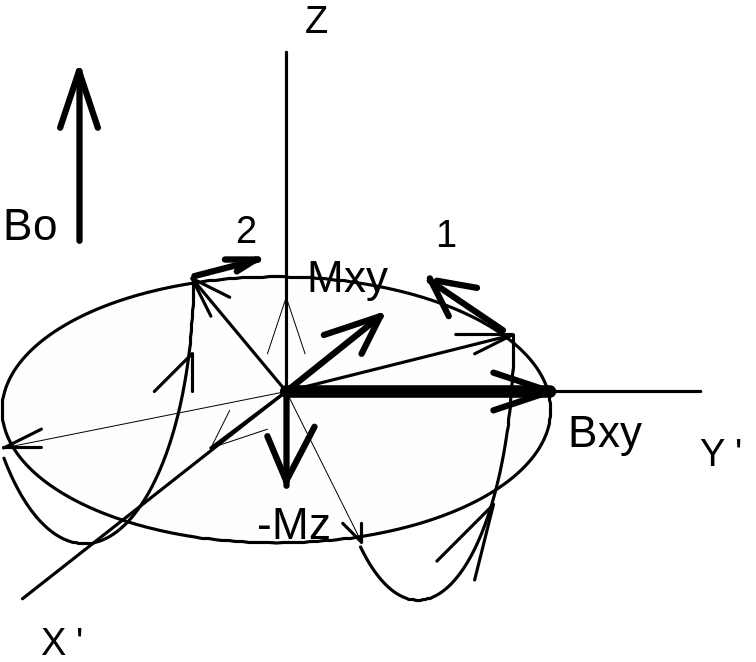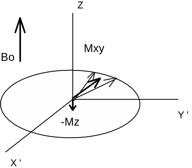На рисунке 17 а) показано положение дел в протонной системе после подачи 90-градусного импульса. Вектор суммарной намагниченности развернулся на 90 градусов и вращается в плоскости (X,Y).