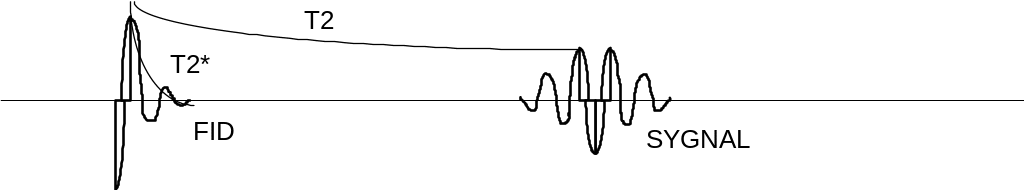 Сначала подается 90-градусный импульс, разворачивающий вектор суммарной намагничености в плоскость (X,Y). При этом сразу после отключения ВЧ-импульса вектор Мxy начинает уменьшаться благодаря расфазировке спиновой системы (Т2 релаксации). Однако, реальное уменьшение сигнала значительно превышает скорость Т2 релаксации. Это быстрое уменьшение Мxy сразу после 90-градусного импульса называется FID - free induction decay - спад свободной индукции. Спад намагниченности во время FID - экспоненциальный, с константой Т2*, см. рис.16. В идеальных условиях профиль FID должен совпадать с кривой Т2 релаксации, однако FID происходит значитльно быстрее, то есть всегда Т2*<<Т2. Причина - наличие неоднородностей в основном поле Во. Из-за этого протоны расфазируются быстрее, чем это им "положено" неднородностями в локальных магнитных полях, связанных со структурой материи. К счастью, эти трудности преодолимы.