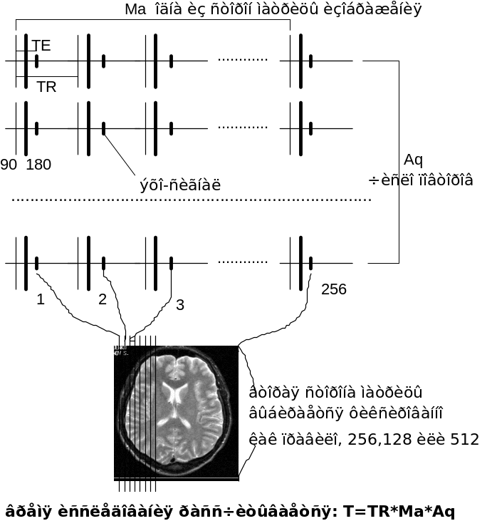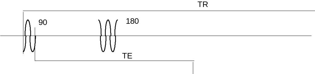 В общем последовательность спин-эхо составлена из повторяющихся через определенный интервал (TR) 90-градусного и следующего за ним 180-гадусного импульса. Сигнал регистрируется после 180 градусного импульса через интервал ТЕ (считается от 90-градусного импульса).