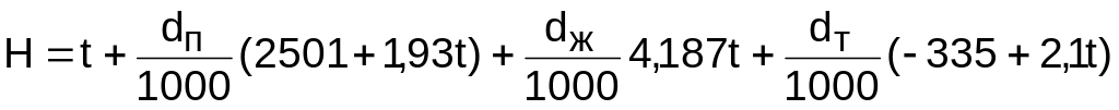 Энтальпия влажного воздуха Н рассчитывается на 1 кг сухого воздуха (кДж/кг с.в.) и определяется как сумма энтальпий компонентов, находящихся в 1 кг сухого воздуха: