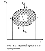 Изобразим прямой обратимый цикл в T,s- координатах (рис.8.3). Необходимо отметить, что для обратимых циклов в диаграммах, как правило, изображаются только процессы для рабочего тела.