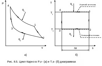 Карно предложил идеальный цикл тепловой машины, в котором используются два источника теплоты с постоянными температурами: источник с высокой температурой – горячий источник и источник с низкой температурой – холодный источник. Поскольку цикл идеальный, то он состоит из обратимых процессов теплообмена между рабочим телом и источниками теплоты, соответствующих двум изотермам, и двум идеальным адиабатам перехода рабочего тела с одной изотермы на другую. Графическое изображение цикла Карно в P,v- и T,s- диаграммах, использующего в качестве рабочего тела идеальный газ, представлено на рис.8.5.