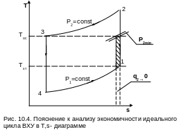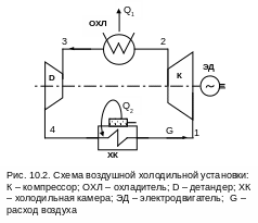 Из компрессора воздух поступает в охладитель, где он изобарно охлаждается до температуры окружающей среды Тос (процесс 2-3), передавая теплоту q1 во внешнюю среду. Из охладителя воздух поступает в воздушную турбину – детандер. В детандере воздух расширяется до первоначального давления Р1 (процесс 3-4), в результате чего его температура становится ниже температуры холодного тела (Т4<Тхт) и создаются условия для отвода теплоты от охлаждаемого тела. Детандер, реализуя процесс адиабатного расширения воздуха, частично компенсирует затраты работы на привод компрессора. Из детандера воздух поступает в холодильную камеру, где он изобарно нагревается (процесс 4-1) за счет отвода теплоты от охлаждаемого тела (охлаждение эскимо на рис. 10.2).