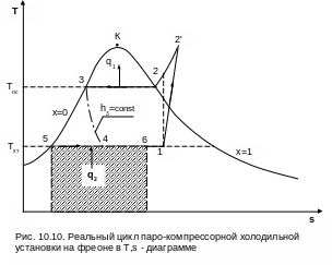 В реальном цикле ПКХУ начало процесса сжатия рабочего тела (точка 1) смещается в область допустимых начальных влажностей, что диктуется требованием надежной работы первых ступеней компрессора (х1доп=0,88). В результате этого завершение процесса 12’ осуществляется в области перегретого пара (рис.10.10). Такое смещение процесса сжатия приводит к увеличению затрат работы на привод компрессора и, соответственно, к снижению холодильного коэффициента ПКХУ.