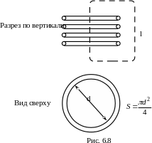 Условно можем изобразить катушку, состоящую из нескольких витков, и показать геометрические размеры, введенные в формуле индуктивности. На рисунке 6.8 приведен разрез катушки и вид сверху.