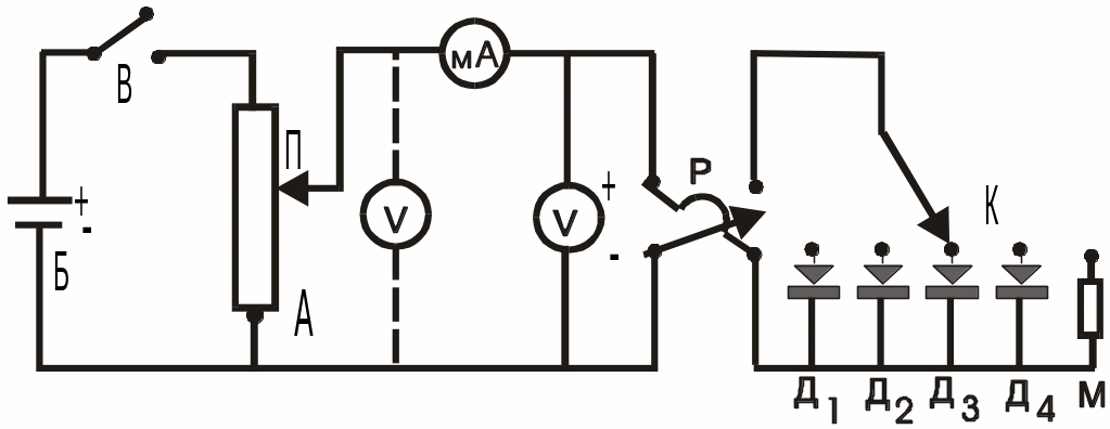 У цій схемі Б- джерело постійної напруги, В– вимикач, П – дільник напруги для плавного регулювання напруги, V- високоомний вольтметр, мА– міліамперметр, Р – двохполюсний перекидний перемикач для зміни напрямку струму, К– комутатор для увімкнення в ділянку одного з діодів Д чи металевого опору М.