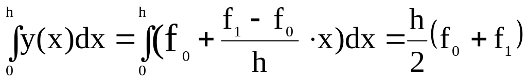 Этот интеграл приближенно заменяем площадью заштрихованной трапецией, ограниченной сверху прямой линией, проходящей через точки (0, f0) и (h, f1). Функция и трапеция показана на Рис.2.1.
