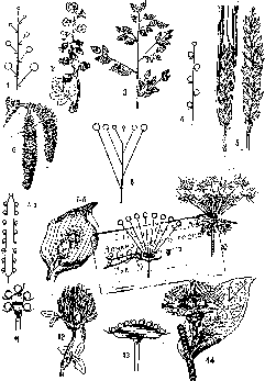 Колос — это соцветие, которое можно себе представить как кисть, у которой цветки без ножек, вследствие чего они и сидят прямо, на стержне (рис. 10, фиг 4—5) Несколько колосков, собранных вместе, образуют сложный колос. Хорошо известны, например, колосья ржи, пшеницы, ячменя и др. Колос с мягкой, часто свешивающейся осью носит название серёжки, например у берёзы, тополя, дуба и т п. (рис 10, фиг. 6) Если ось соцветия становится мясистой, толстой, то колос превращается в початок> как, например, у белокрыльника (рис 10, фиг. 16).