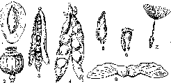 Довольно часто весь стебель или часть стебля бывают под- эемными^ тогда онм носят название корневищ (рис. 1, фиг. 6). Их легко отличить от корней тем, что они имеют на себе, маленькие чешуйчатые листья Подземный стебель иногда укорачивается и вздувается, и тогда получается клубень (рис. 1, фиг. 7),'например у картофеля.