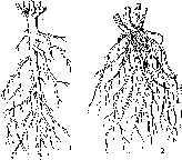 У растений, обладающих мочковатыми корнями, главный корень, служащий продолжением стебля, быстро отмирает (рис. 12, фиг. 2).