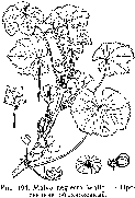 Цветки правильные, белые или беловатые. Венчик из 5 сросшихся лепестков. Чашечка • пятинадрезная. Имеется подчашие из 3 листочков. Лепестки равны чашечке или немного короче её. Тычинок много, сросшихся основанием в трубочку. Эта трубочка окружает большое количество пестиков. Листья очерёдные, черешковые, кру- глос!ердцевидные, слегка пя- ти-самилопастные.. Стебель лежачий, восходящий. Рост 15—30 см. О. Цветёт с половины июня до осени. Сорное, по дорогам, огородам, садам, паро- isbiM полям, окоЛЧШдомов.