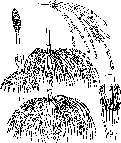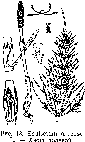 11. Equisetum heleocharis Ehrh. — Хвощ иловатый. Стебли спороносные и бесплодные одинакового вида, зелёные, с неглубокими бороздками, с широкой центральной по-. лостью. Влагалища короткие, цилиндрические, прижатые к стеблю, с 15—20 лан- цетно-шиловидными зубцами, чернобуры- ми, с узкой белой каймой. Рост 20—80 см. 2).. Споры в июне и июле. По болотам, берегам озёр.