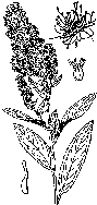 296. Spiraea sa!icifo!ia L. — Спирея иволистная. Розовые, реже беловатые цветки собраны в пирамидальные метёлки высотой до 12 см на концах стеблей и ветвей. Чашечка и венчик пятилистные. Тычинок много. Пестиков 3—8, большей частью 5. Листья очередные, остропильчатые, снизу с выделяющейся сетью жилок. Рост 90—200 см. 2f .Цветёт в июле—августе. Разводится.