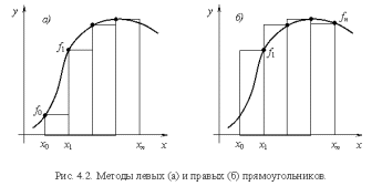 Выбирая константу равную значению подынтегральной функции в левой (рис. 4.2 а) или правой (рис. 4.2 б) границах отрезка в случае постоянного шага интегрирования приходим к формулам левых и правых прямоугольников, соответственно: