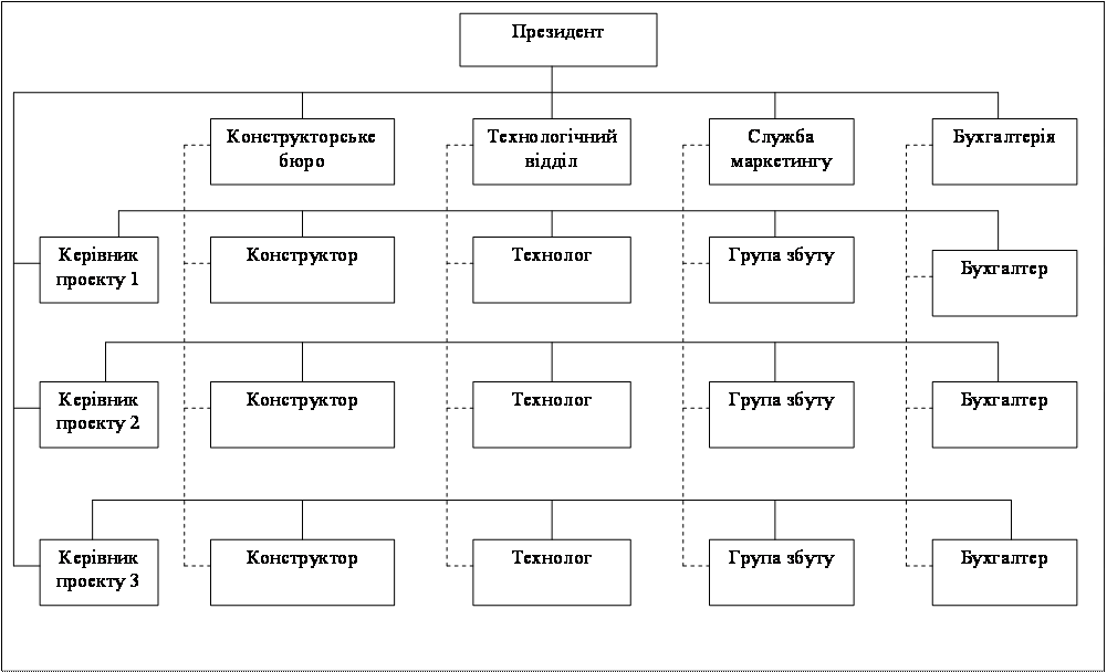 Матрична структура передбачає використання функціонального і дивізіонального командних ланцюгів. Матрицю утворюють подвійні лінії владних повноважень. Горизонтальний командний ланцюг відображає взаємодію і забезпечує координацію функціональних підрозділів, а вертикальна структура - традиційне управління всередині них. Вищий керівник підприємства відповідає за матрицю в цілому, тобто як продуктовий, так і функціональний командні ланцюги, за підтримку балансу владних повноважень між двома сторонами матриці, за вирішення можливих протиріч.