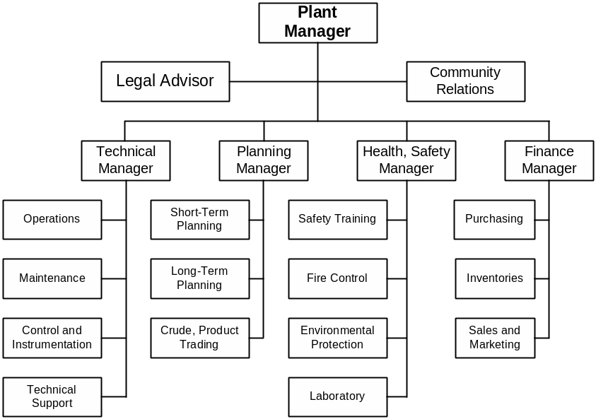 More than anything else, safety and reliability depend on people who work in a plant. A typical U.S. or Canadian refinery employs 500 to 750 people. About half of these are operators and 20 to 25% are engineers. Figure 13.1 shows a typical refinery organization chart.