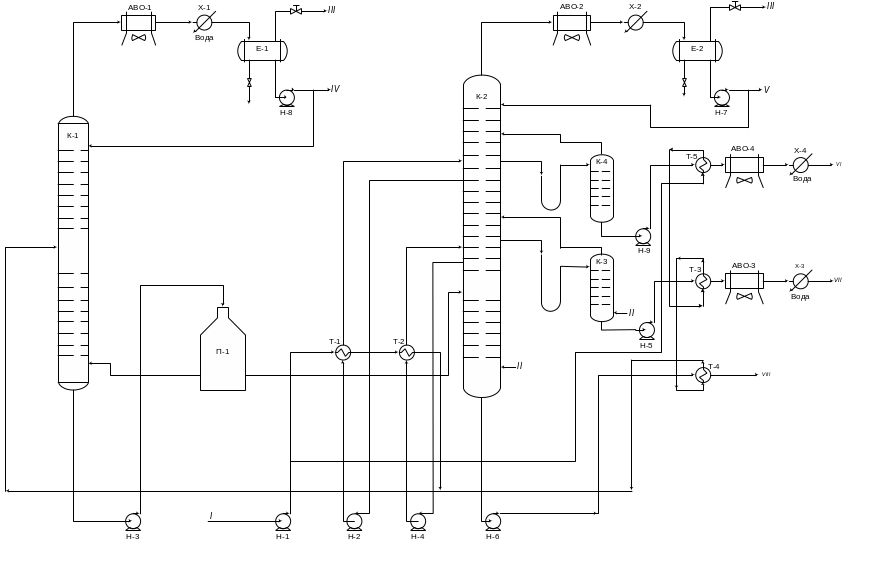 Н-1-9– насосы; Т-1-5– теплообменники; Х-1-4– водяные холодильники; АВО-1-4– аппараты воздушного охлаждения; К-1– ректификационная колонна; К-2– основная ректификационная колонна; П-1– трубчатая печь; К-3,4– отпарная колонна.