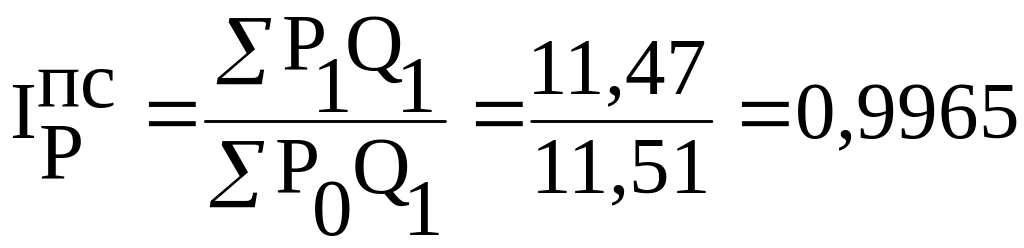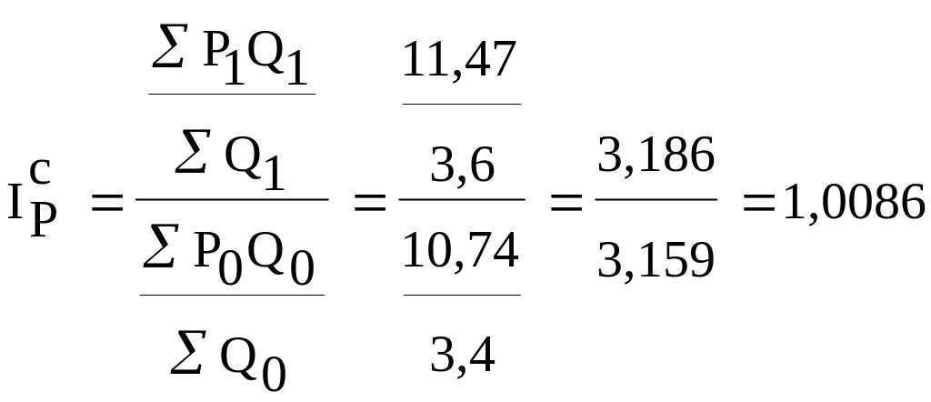 Отже, якби зміна цін не супроводжувалася структурною зміною продажу, то середня ціна змінилася б до 0,9965, але зміна структури продажу привела до зміни цін до 1,0122. Одночасна дія двох факторів привела до зміни середніх цін до розміру 1,0086.