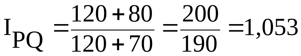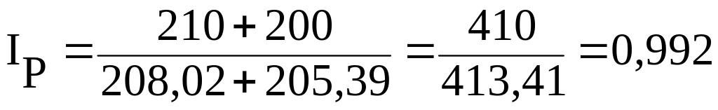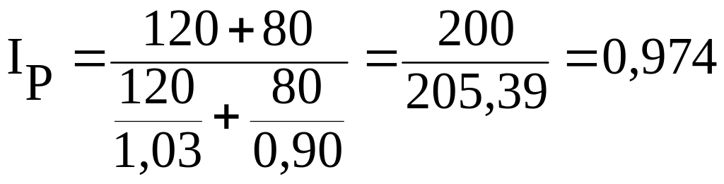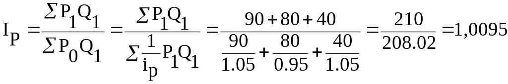 Отже середній індекс цін у звітному періоді зріс на 0,95%. Різниця 210 – 208,02=1,98 тис. грн. – це розмір утрат населення від зростання цін на промтовари або збільшення доходу (виручки) продавців.